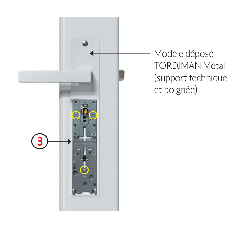 3/ Fixez la plaque métallique dans la poignée à l’aide des 3 vis fournies