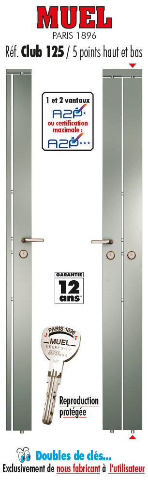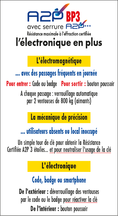 C’est d’abord une serrure CLUB 125, donc avec la certification maximale A2P trois étoiles et en plus un second système de fermeture de votre porte avec deux aimants de très forte puissance qui s’activent automatiquement et se désactivent en tapant un code sur un boitier fixé à l’extérieur.